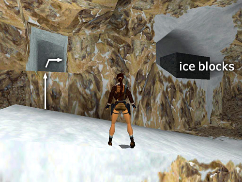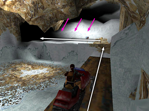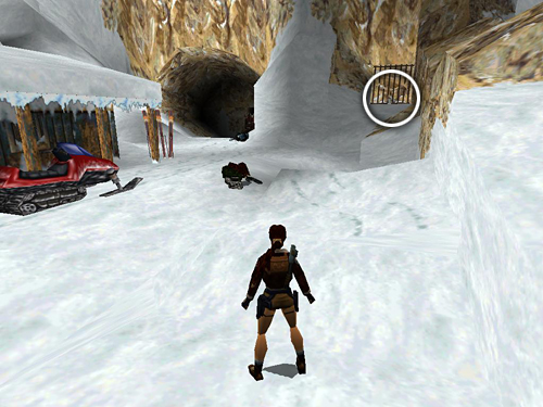 CAVE WITH SNOWMOBILER: Continue to an opening overlooking a large cave. When you drop down to the floor, another guy on a snowmobile (28) drives in from the other side. You can shoot him while dodging or run immediately to the back of the snowy block and climb on top. (screenshot) The snowmobiler can still shoot Lara up there, but at least he can't run her over. Once you've taken care of him, you can steal his snowmobile or continue on foot.