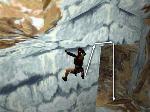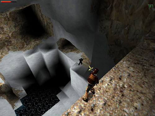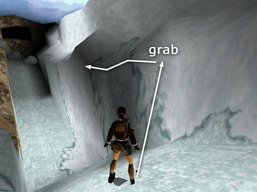 To climb down to the pool, walk to the right side of the cliff edge, turn around, drop back and grab the edge, traverse all the way to the wall on the left and then drop to the snowbank below. Lara will slide to a stop on the ice ledge. The sniper in the cave isn't carrying anything, so you needn't bother going over there. Instead take a carefully angled running jump off the corner of the ice ledge to land in the water. Be sure to set up this jump precisely; otherwise Lara will hit the ice instead of the water. Alternatively, turn around to face the cliff wall. Then safety drop from the left side of the ledge to the ice below. Swim to the small, stone ledge in the opposite corner, climb out of the water and follow the passageway to the next level. (screenshots)