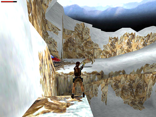 NOTES: Sharon, one of the alt.games.tombraider regulars, suggested an alternate strategy: Park the snowmobile near the key, facing the exit. Then picking up the key, get on the snowmobile and speed away before the nasty guy can get a lock on Lara. Keep going until you get past the big jump over the canyon. He can't follow on his heavy machine.