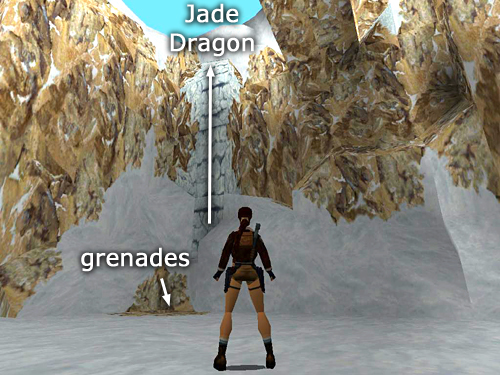 AT THE BOTTOM OF THE CANYON: Climb down to the canyon floor and cross to the opposite corner. Drop into the shallow pit to find 2 pairs of grenades (15-16). This pit is directly below the ledge where you found the Jade Dragon earlier. If you missed it before, you can climb the ice ladder here to reach it. (screenshot) Three leopards (19-21) start prowling the canyon floor when you go into the pit. If you don't want to confront them at close range, you can shoot them one at a time with pistols from inside the pit by jumping straight up and down while firing.