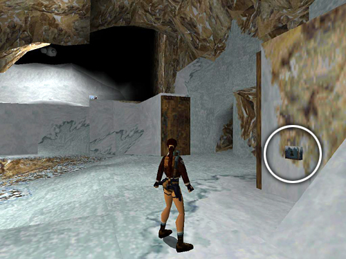 Drop into the hole in the floor and follow the tunnel to a wall of ice. Draw weapons and Lara will automatically target the thug (18) on the other side. Take care of him and continue up the slope to the next room. Walk cautiously forward to trip the icicle trap. Then jump over the icicles and pull the switch to open the gate above. Go through the gate to emerge at the bottom of the canyon where you made the long snowmobile jump earlier.