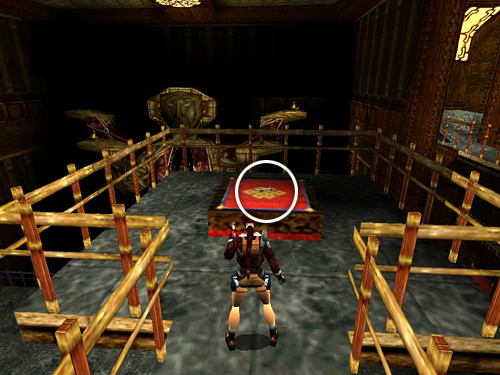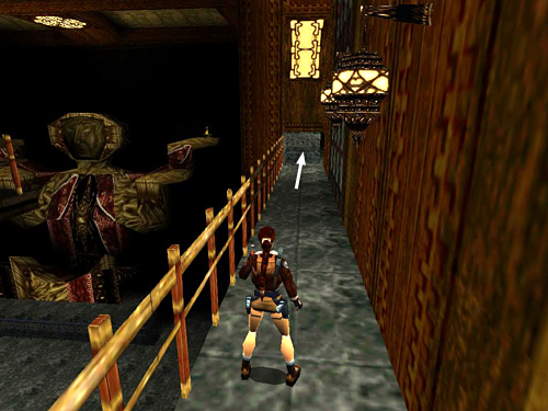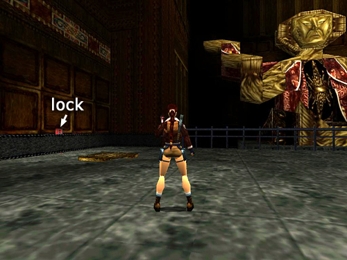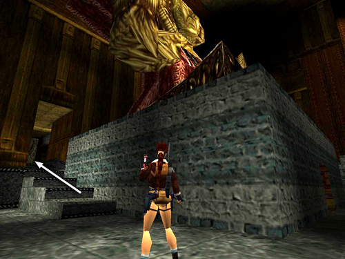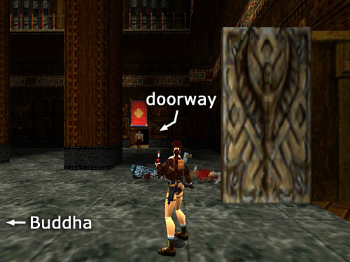 WALKWAY ABOVE MAIN HALL WITH GIANT STATUE: Follow the walkway out to the middle of the room and retrieve the MAIN HALL KEY (9) from the low platform. (screenshot) As long as you haven't attacked his brothers, the monk won't mind. Return to the edge of the room, turn left and continue along the walkway around the corner to the end. The giant statue will then be on Lara's left. (screenshot)