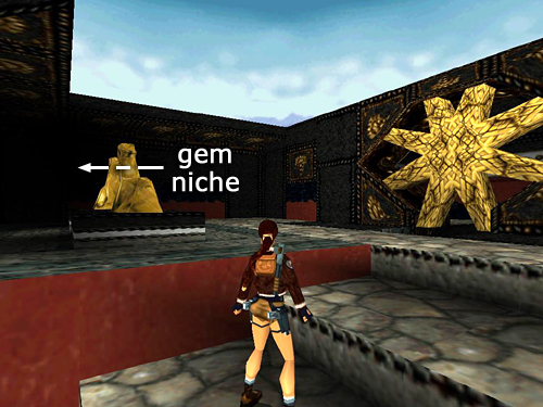 MAIN HALL - ON TOP OF THE STATUE: Cross the room and enter the second door on the right side when facing the statue. Climb the ladder and follow the hallway to an opening overlooking the statue. If Lara is holding a flare, drop it now. Then take a running jump to grab the lower of the statue's two extended hands. Pull up and climb onto the upper hand. From there, take a running jump to grab the head. Pull up, cross the head, then jump onto the other raised hand. Walk to the edge, take a standing jump to grab the alcove above and pull up. (Holding a flare here should not cause a problem.) Place the second GEMSTONE in the niche to open a trapdoor in the room underneath the statue. (screenshots)