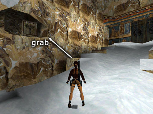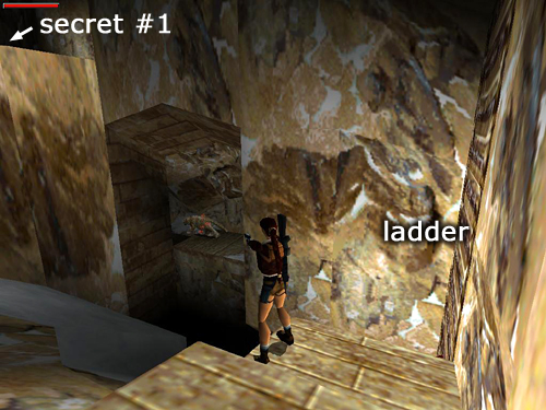Swim through the opening at one end of the pool into the next cave. Don't bother getting out on the icy bank on the right, since there's nothing there but falling icicles. Instead continue forward and around to the left. Climb out of the water on the snowy ledge between this cave and the next. Turn around and you'll see a ladder above you. Stand underneath it and jump straight up to grab it. Climb nearly to the top, then do a backflip off the ladder to land on the ledge behind you. (This jump can be tricky. To set it up, climb all the way to the top of the ladder. Then back down one rung, so Lara's feet are on the seam between the top two ladder textures. Now just press Jump to do the backflip and land on the ledge.) Here you'll find SECRET #2, the Jade Dragon (29). Pick up the secret and walk back to the edge of the slope. Step off, slide and jump to grab the ladder. Then climb back down. (screenshots)
