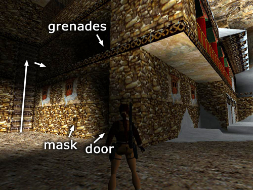 Return through the area with the FROZEN POND to the dark area on the left where you just fought the leopards. Use the low block to climb back into the cave Then drop down on the other side into the area with the BUILDINGS AND WOODEN BRIDGE. Go around the left side of the building with the red trim. Climb the ladder on the back wall and retrieve 2 pairs of grenades (14-15) from the ledge. Drop down and use the TIBETAN MASK to open the door. (screenshot)