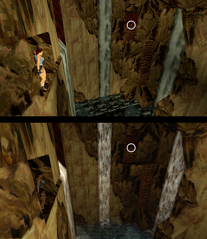 NOTE: High above the pool on the left, you may notice another ladder on the rock wall. (screenshots) There is a room at the top with a large medi pack inside. In the classic game, there was no way to get there, short of using a flight patch or editing a save file to put Lara at the top of the ladder. (You can download a PC savegame file with Lara at the top of this ladder here. Instructions for using save files are here.)