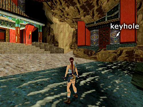 When you have the Gold Dragon, dive into the water and allow Lara to be swept over the falls. Swim to the far right corner of the pool (i.e., right when Lara's back is to the waterfall). Climb out on the wooden platform and shoot the 2 carp (1-2). Note the keyhole on the wall here, the gate on the left and the ladder on the right leading up to a closed trapdoor. Apparently you'll need a key.