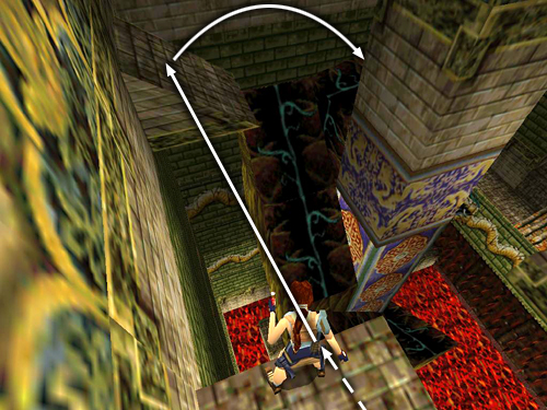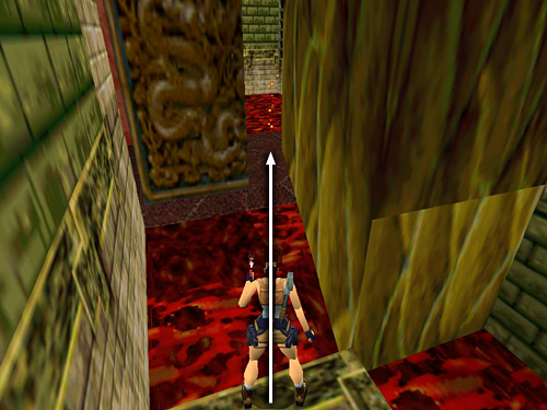 Climb down the block steps along the right wall (i.e., right when facing in the same direction as the dragon) and slide down onto the flat ledge just above the lava. Take a running jump across the lava to the small, square ledge just ahead and another running jump the next small ledge. Turn left to face the short, angled block near the stone pillar supporting the walkway. Carefully set up the next running jump by walking to the edge, hopping back once and then turning just slightly to the left. (This will ensure that Lara lands on the sloping block facing downhill.) Then take the running jump onto the slope and immediately jump again to grab the edge of the taller angled block ahead. Pull up, slide down the back of this block and immediately jump to land on the tall, flat block ahead. Turn right and take a running jump to grab the taller block against the wall. Pull up. (screenshots)