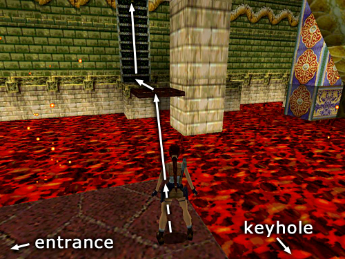 MAIN CHAMBER: Enter this large, lava-filled room. Move to the end of the walkway and jump over to the small, square ledge near the keyhole. (You'll be getting the key shortly.) From here jump to the larger ledge on the right. Run across, jump onto the raised block and quickly climb the ladder before the spiked wall moves in from the right. Dismount on the ledge above. (screenshot)