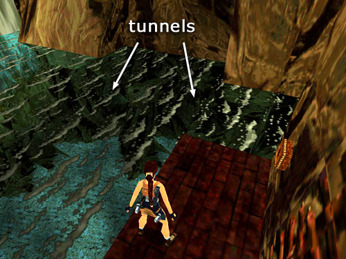 NOTE: If Lara is running out of air at this point, swim out of this tunnel and pull lever 2 (the one you passed a moment ago). It's on the far wall of the wide tunnel, just below and to the left. (screenshot) This lowers the water level and sweeps Lara back into the big pool so she can breathe. Then use lever 1 again to raise the water level and swim back to the passageway where you found the medi pack.