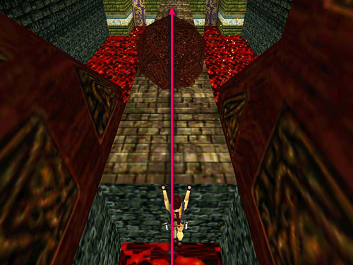 Next comes a doorway with buttons on each side and a lava-filled hallway with breakaway floor tiles beyond. The button on the right raises a grate between the solid floor and the tiles; the one on the left opens the gate beyond. Press the right button, side flip, press the left button, and run through the doorway. When you reach the end of the tiles, a boulder rolls down from above and behind. You can try and outrun it, jumping at the end of the bridge to grab the ledge opposite. Or, you can backflip over the boulder as it rolls along. However, I found it easier to cross the broken tiles, stop immediately on the first solid block and then quickly hop back, grab the edge of the floor and hang there as the boulder passes above. Then pull up and continue at a leisurely pace. (screenshot)