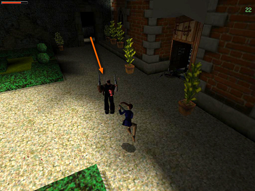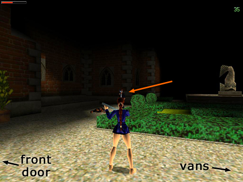 When you've taken care of them, the final enemy, a thug with 2 big guns (16), comes through the gate leading to the assault course (i.e., to the left of the front door when facing it). This last mini-boss is like the one in the crate room in the Opera House. His guns can do quite a bit of damage, so get a lock on him and jump back and forth from side to side while shooting. (screenshot) Or, try getting behind him and chasing him in circles while shooting. He's hard to kill but when he falls, that's the end of the game.