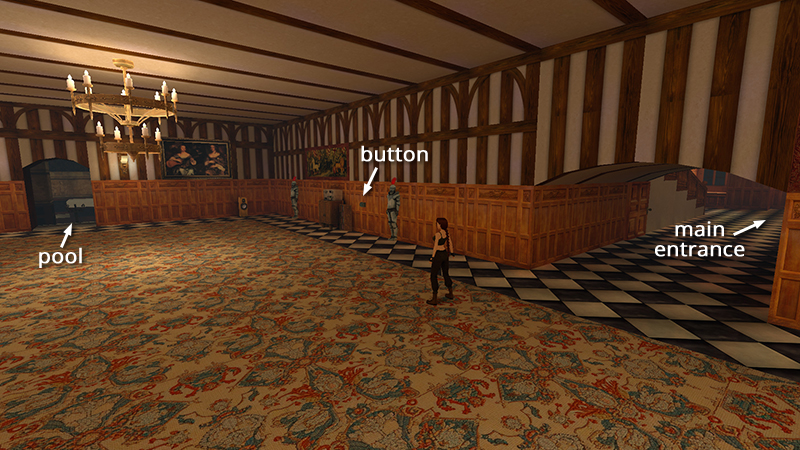 Below the floor is a water-filled room containing 10 sets of Uzi clips and 2 large medi packs (13-24). The square holes in the floor lead down there. If you're careful, you can retrieve most of these items before Bartoli transforms. The change only occurs when Lara steps inside the "trigger zone", which extends for one square around all sides of the central area with the four columns. As long as you avoid this area—both above and below the water's surface—you'll be safe.