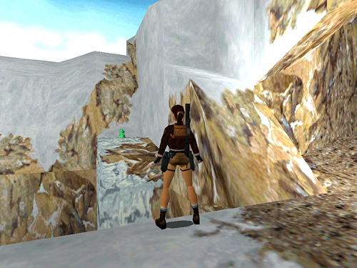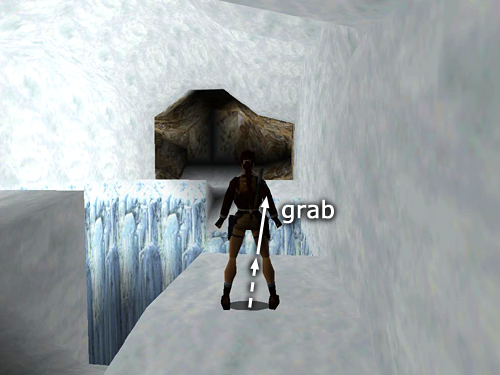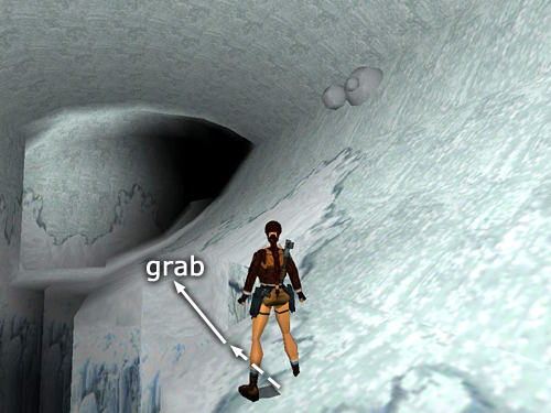 CAVES AND NARROW ICE BRIDGE: Continue through the tunnel until you reach a wide gap. This next jump is a bit tricky so save the game before attempting it. Move to the right side of the gap and set up the jump carefully: Walk to the edge and then hop back once. Take the running jump and press Action at the last minute while Lara is in the air to grab the opposite ledge. (screenshot) Pull up and keep walking.