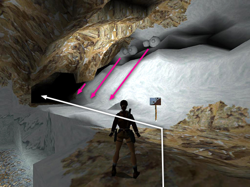 HUT TO OPEN AREA WITH RAMPS AND LEDGES: After killing the enemies at the hut and picking up the Silver Dragon near the barred passage to the right of the hut, hike into the cave on the left. After a while you'll meet another bad guy. Kill him and continue to the OPEN AREA WITH RAMPS AND LEDGES. Climb onto the snowy ledge and jump from there into the smaller opening to the left of the one with the ice blocks. (screenshot) Follow the passageway around to the wide tunnel and kill the 2 leopards that charge from the left. Or, if you don't care about getting all the kills, climb into the cave next to the ice blocks instead. As long as you don't enter the narrow passage on the left, the leopards won't appear. (screenshot)