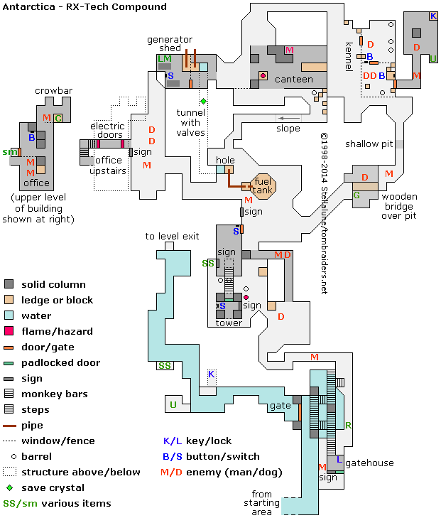 NOTE: If you're missing the key or the crowbar, you'll need to go back for them now. You probably left the crowbar in the TOWER WITH THE RX-TECH LOGO after Lara last used it. Monkey swing across the water and follow the tunnel back to the compound. The tower is just ahead on the left. Climb up into it and you should find the crowbar lying on the floor next to the door you pried open earlier. (screenshot) If you missed the key, from the TOWER area, go through the dark passageway to the FUEL TANK. Then follow the snowy tunnel on the right, cross the WOODEN BRIDGE ABOVE THE PIT, and continue to the KENNEL. Enter the building to find the key, as described above. Then return to the GATEHOUSE. The RX-TECH COMPOUND MAP may also help.