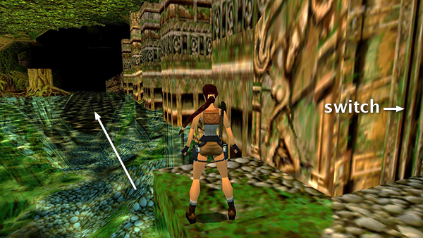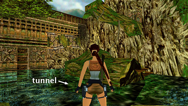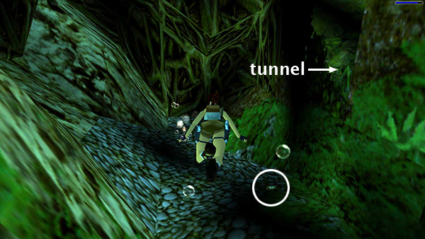 SHORTCUT INTO RUINS (UNDERWATER PASSAGE): When you come to the CALM POOL WITH FLOATING LOG AND PASSAGE TO SECOND ZIP LINE (described above), rather than climbing onto the tree branch above the little island and pulling the switch to open the gate, just swim across the pool to the far corner, where the ruins meet the rock wall. Here you'll find an underwater tunnel. (screenshot) Swim through until you can surface. Then climb up onto the walkway and use the 2 switches. One opens a golden door in the next room; the other opens the underwater gates into that room. Swim on through.
