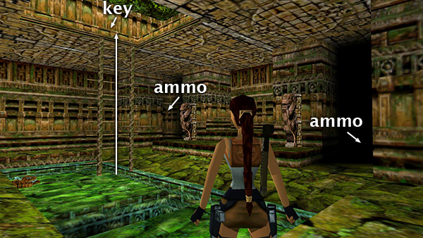 NOTE: If you like, you can tread water until the tiger moves away. Then climb up into the shallow water and quickly jump forward to grab the ladder. Climb to the top of the ladder, pick up the key (as described in the next paragraph), and shoot the tiger from above. Once it's dead, climb back down to get the ammo in the alcoves before moving on.