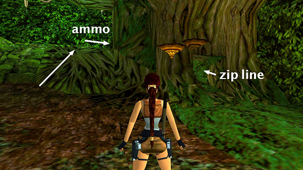 DENSE JUNGLE WITH BOULDER SLOPE: At the bottom of the zip line, climb onto the square stump and take a running jump into the raised opening ahead. (screenshot) Enter the dark passageway and ready weapons to kill the tiger (3) that charges from behind the rock ahead. The shotgun works great here. Or, if you like, you can jump up onto the rock on the left and shoot the tiger from safety with pistols. The odd shape of the rock makes this a little tricky, though. This screenshot shows where to jump.