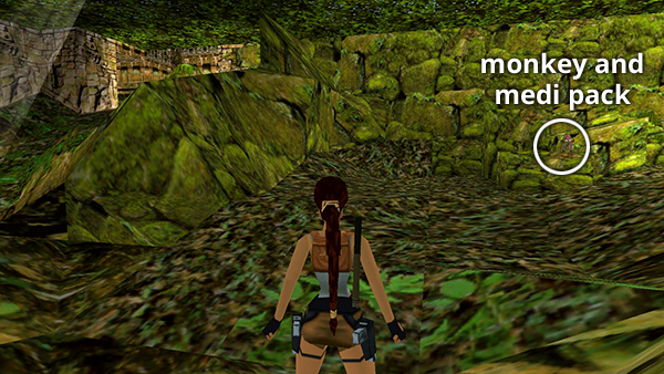 Hop down and go up the hill to the far right corner of this area to find a small medi pack (12) on a stone block. One of the 2 monkeys (4-5) may beat you to the medi pack (screenshot), in which case you can either shoot the monkey or patiently follow it until it drops the medi pack near the cache of flares (described below).