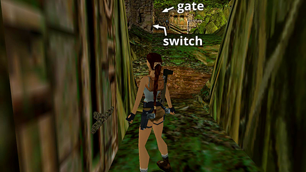 Head for the top of the slope where the boulder originated and go into the room on the left. Pull the switch to open the gate just outside. (screenshot)
