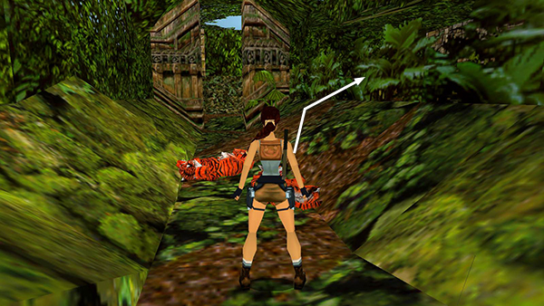 Enter with weapons drawn. A tiger (6) emerges from the bushes ahead on the right. If you like, you can back up into the safety of the doorway. The tiger won't follow Lara that far. You may need to advance and hop back a few times to draw the tiger out from cover. (screenshot) Once it's dead, proceed along the path to the far doorway. A second tiger (7) charges from around the bend. Either us the shotgun to take it down quickly or get a lock on it with your pistols (hold Action) and backflip away shooting.