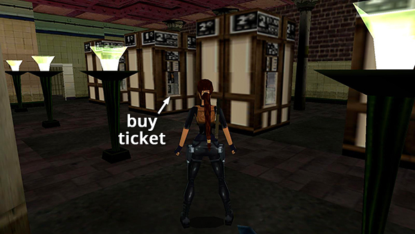 ROOM WITH TICKET MACHINES (again): Kill the gang member (12) lurking just inside on the right. Then use the OLD PENNY you found earlier in the fourth machine from the ticket window to buy yourself a TICKET (27). Note that each kiosk houses two ticket machines, so the fourth machine is on the right side of the second kiosk. (screenshot) Also, don't forget to pick up the ticket when it drops out of the machine onto the floor.