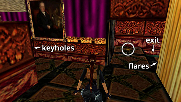 NOTES: If you are missing either of the Solomon's keys, you'll need to backtrack for it now. Directions to each key are included on a separate page. If you missed the UZIS in the ROOM WITH THE STACKED CRATES, you'll get the weapons here instead of ammo.