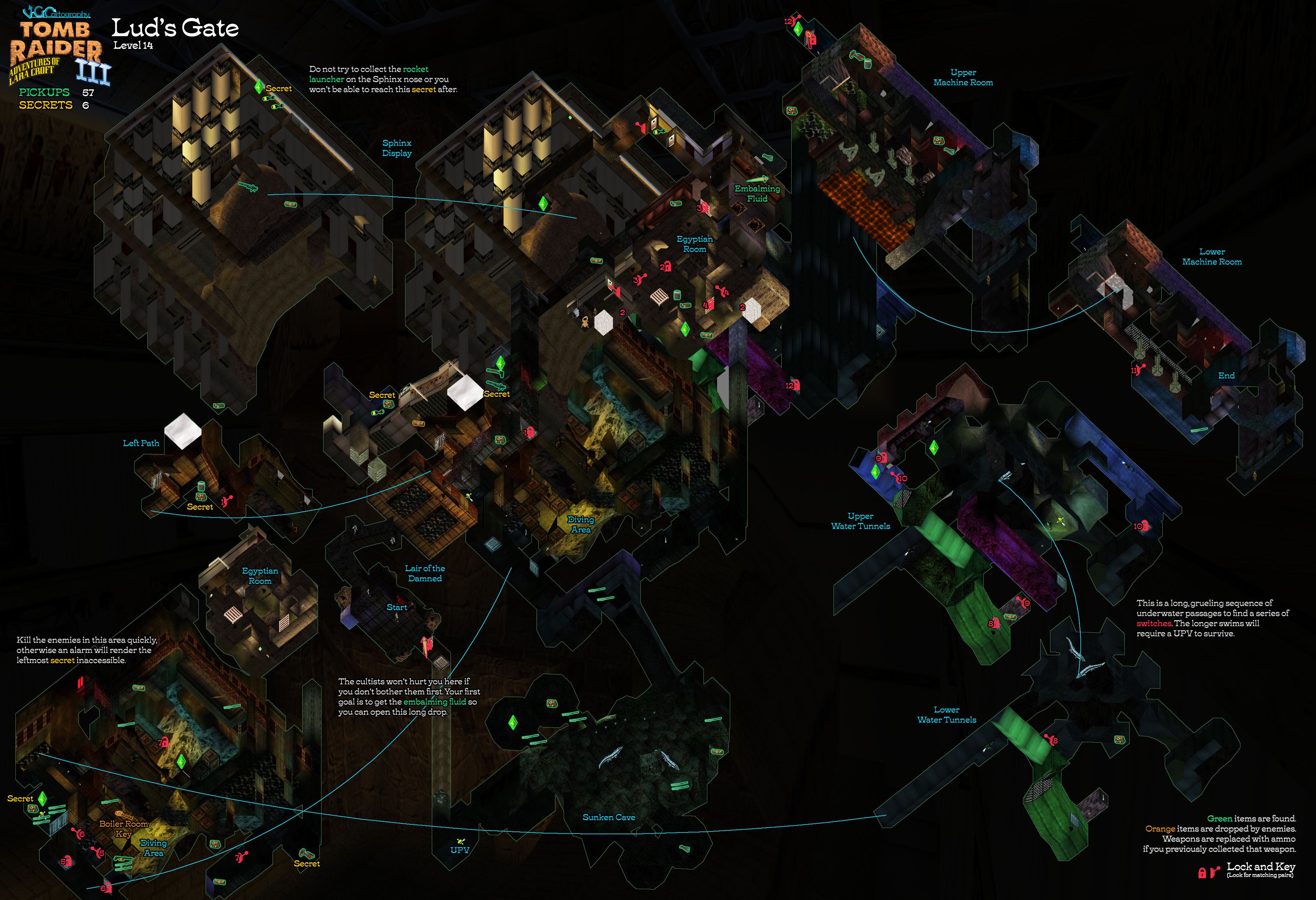 ACKNOWLEDGEMENTS: Special thanks to the participants in the alt.games.tombraider newsgroup, without whom some parts of this walkthrough could not have been written. Thanks also to Cadfael, Dennis, John G., Gus, Hank, Haydon, Helena, John M., José, Kathy, Lindsey, Megan, Mike B., Paul, Peder, and Terry, who sent in contributions for this level. Special thanks to Sugarmama, Jeff Reid, Megan, and Jack for refinements to the secret #6 bug avoidance strategy, and to Footi for much help with useful glitches and 100% completion over the years.