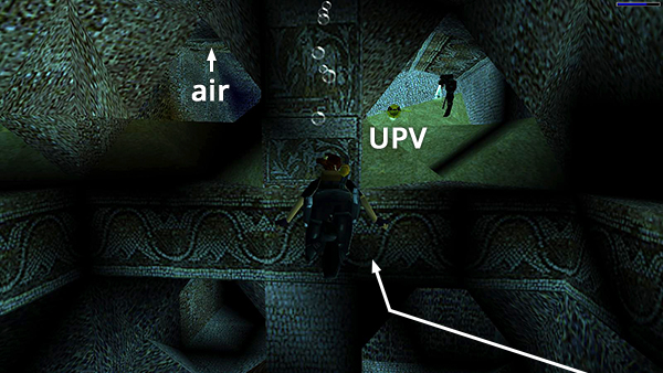 UPV NOTES: If you missed Secret #6 and didn't get the second UPV, just swim through the diamond-shaped tunnel to the next area, where you'll find a third UPV in the upper right alcove on the right wall, along with a mysterious, dead scuba diver. (screenshot) Also, you may be able to take advantage of a minor glitch to extend Lara's air supply. If you drive the UPV along the ceilings—especially the peaked ceilings in the diamond-shaped tunnels—you'll hear Lara gasp for breath as her head pokes out of the water-filled area. This is tricky, but it may help you survive a little longer.
