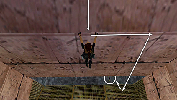 NOTE: There is a rocket on a ledge partway down the ventilation shaft. It's not difficult to get, but you'll need to take a shortcut and miss a lot of action and two secrets, preventing you from accessing the bonus level at the end of the game. Also, your new friends will never get their precious embalming fluid. If that's OK, turn around and jump to the remaining break-away tiles on the left. Fall through and hold Action to grab the lowest slope. Traverse to the left and drop to a flat spot near the rocket. (screenshot) Then fall down the hole into the water. Pick up the walkthrough at the AREA WITH GUARD AND FROGMAN, below. If you must have that rocket, you can use the PC flight patch (for the classic game) or flying UPV glitch (classic or remaster) to get it.