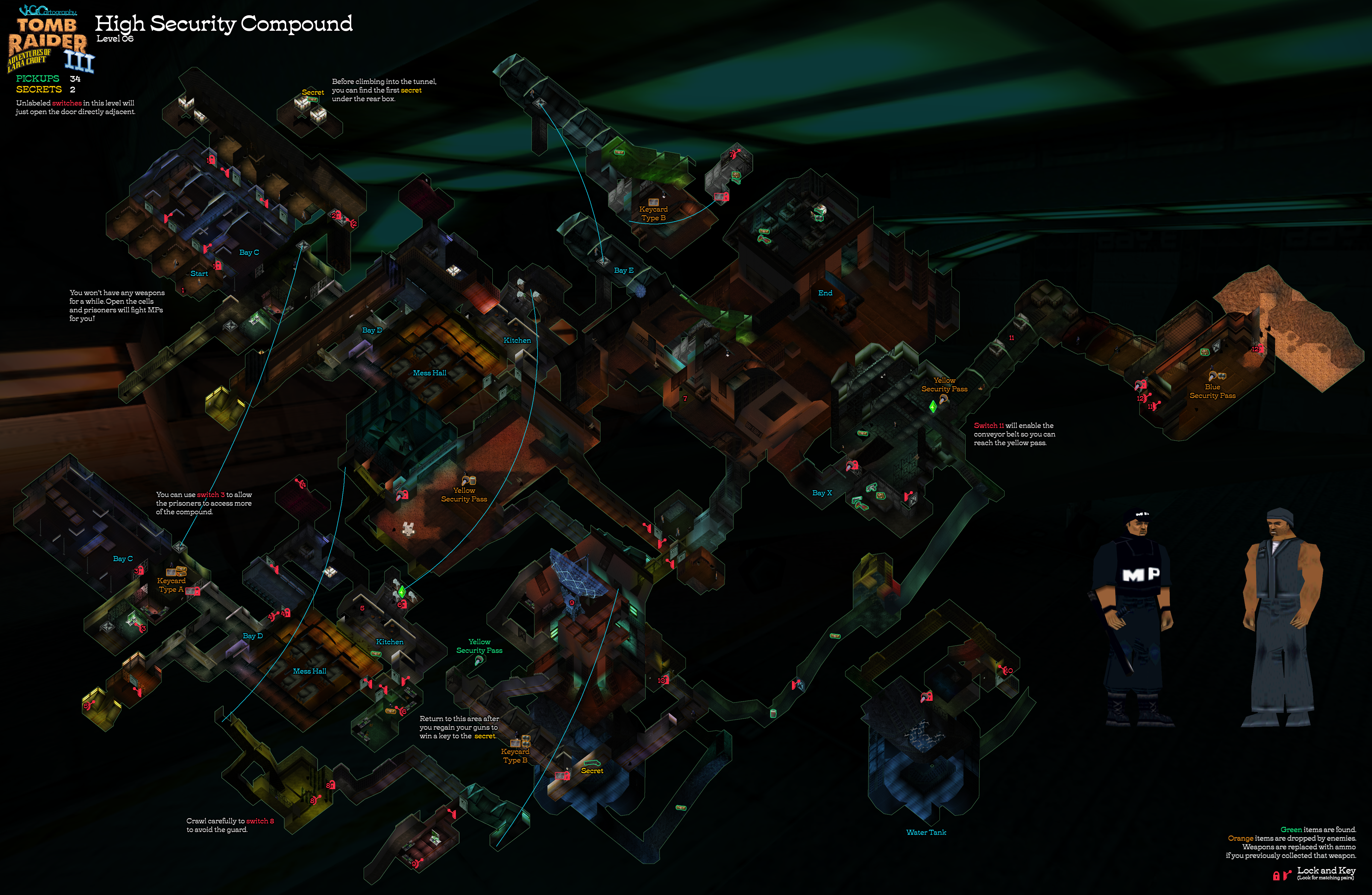 ACKNOWLEDGEMENTS: My eternal gratitude goes out to the participants in the alt.games.tombraider newsgroup, without whom some parts of this walkthrough could not have been written. Thanks also to Alex, Bo, Cujo, Eldor, Eric R., GreenApple968, Hazel, Horst, Jason P., Jeff, Mitchi, Peter, Scot, and Stephen D. for their help on this level, and to the many players who reminded me about the small medi pack in the dark tunnel leading from the pool to the hallway with the guard holding the second yellow key.