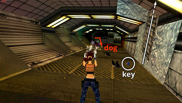 NOTES: The route described below takes you through this area with little no injury for Lara, but if you like, you can take a substantial shortcut here without missing any kills or pickups. Lara will lose half her health in the process though. Instead of going around to the glassed-in control room and then dropping into the pool, as described in the main walkthrough, just hop down from the doorway to the ledge below and then safety drop to the floor. This page with screenshots includes additional details. You can then skip all the way down to the section on retrieving the yellow security pass, below. I recommend taking this shortcut if you are not a strong swimmer, since it will allow you to avoid a difficult swimming sequence.