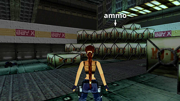 Climb the stack of boxes on the left to find some Desert Eagle clips and a small medi pack (31-32) in a depression in the middle of the pile. (screenshot) Climb down and head for the far right corner of the storeroom (i.e., the right when Lara's back is to the entrance). The fourth box from the corner is movable. (screenshot) Pull it out to reveal an alcove containing Uzi clips and grenades (33-34). When you have everything, step into the back of the truck to end the level. (screenshot)