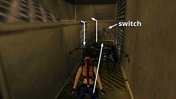 COMPOUND ROOF: Move forward to the edge of a pit lined with barbed wire. Take a running jump across the pit—on the right side to avoid taking damage—and grab the opposite edge. Pull up and continue forward. Walk through the next coil of barbed wire, across a closed trapdoor, then through another barbed of wire. Pull the switch to open the trapdoor. Move into the corner to the left of the switch and pull up onto the ledge above. (screenshot) Take a few steps to the left to the top of the ladder, drop and hang from the edge, then climb down the ladder into the hallway about halfway down on the left. (screenshot) Don't go all the way to the bottom, since there's more barbed wire below.