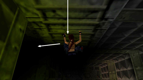 Stand beneath the duct made of black metal grating and jump straight up to grab it. Continue holding Action and use the direction buttons to monkey swing across the room to the ledge with the small medi pack (29). Release Action to drop onto the ledge. Grab the health, turn around, and jump up to grab the grating again. Now monkey swing forward to the middle of the room, turn left and follow the duct past the moving hook. It's safe as long as you don't get too close. At the end of the duct, drop down onto the stairs near the wall. (screenshots)