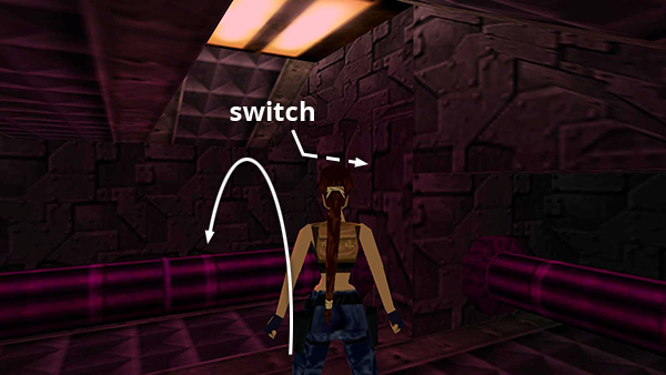 If you reach this point and the metal door is closed, preventing you from entering the next room, then you missed a switch. Return through the crawlspace and the flooded tunnel to the pool at the base of the tower. Fight the current to reach the surface. Climb out onto the burner and pick up the walkthrough at the section where you jump around the edge of the pool to reach the green crawlspace, above.