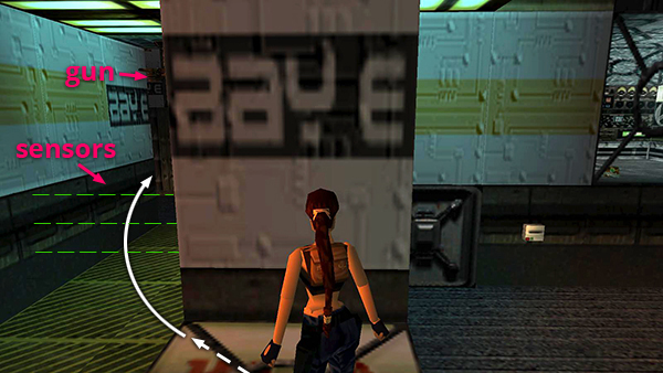 NOTES: It is possible to avoid the guard at the top of the green ramp by running past him, climbing on top of the MJ-12 box, and then taking a running jump around to the right and over the motion sensors. (screenshot) As long as Lara doesn't touch the sensors, she won't trigger the gun. You can then skip the business with the guard, the prisoner, and the keycard, but you will miss the pickups in the room with the button.