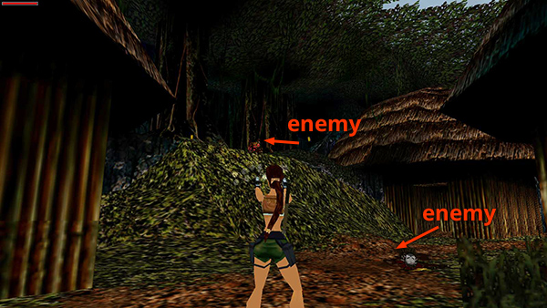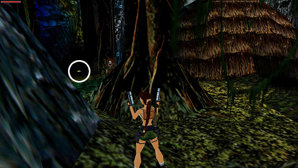 Alternatively, if you slid down from inside the TEMPLE WITH SKYLIGHTS AND DART TRAPS, you'll enter the village on the lower level. Move forward and take out a tribesmen with a spiked club who approaches from the hut ahead and a warrior with a a blowgun on the ledge to the left. If you side flip from left to right while shooting the one with the blowgun, you may be able to avoid being poisoned. (screenshot)