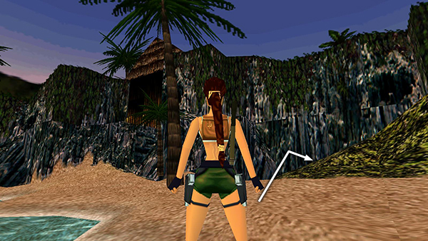 Swim to the other end of the lagoon near the bamboo hut and the fat palm tree. In the middle of this section of the pool, there's a gray stone outcropping with a small medi pack (3) on top. Swim around to the right side of of the rock, where one corner is low enough to reach. Pull up and take the health pack. Then look out across the water to spot a secret. Across the pool you'll see a series of flat blocks just above water level. There is some MP5 ammo (4) sitting on the rightmost block. The leftmost block has a steeply angled block connected to it. Take a running jump from the peak of the rock where Lara is now standing to grab the angled block. Traverse to the right and pull up onto the flat ledge. Turn right, step to the outer corner of this block, and take a standing jump to the next flat block ahead. The chime will sound for SECRET #1, but you'll need to take a running jump to grab the next ledge and then pull up to get the ammo. (screenshots)