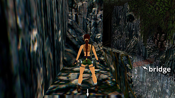 NOTE: At this point you can take a shortcut and climb down into the canyon below instead of entering the temple on the other side of the bridge. You will miss one kill, one large medi pack, and a save crystal inside the temple. Also, you will be forced to take the path to the SERPENT STONE GATES, rather than one of the alternate paths, but you will not miss any secrets. If you want to do this, skip down to the section BEACHSIDE CAVE AND MISTY CANYON.