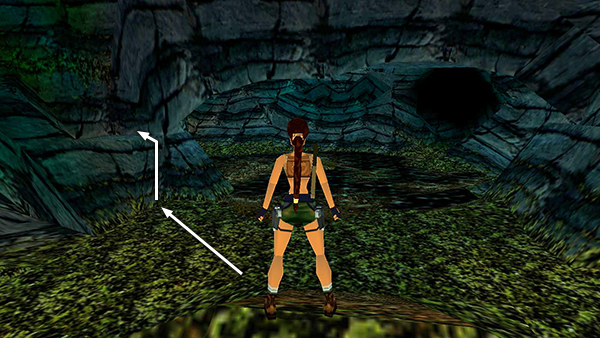 CAVE WITH SWITCHES: To reach this cave, start by positioning Lara so the passage where you entered this area is on her right and the airplane fuselage is on her left. Above and behind is a rectangular stone ledge. Ahead is a lumpy, green wall with a sloping base. Jump up to the flat, triangular spot in the left corner. (This is the same triangle mentioned in the tactic for evading the last raptor.) Face the green wall and jump straight up to grab the edge. Traverse to the right so Lara is hanging in the middle of the wall. Pull up and before Lara can slide back, press Jump to backflip onto the stone ledge above and behind her. Turn around and you'll see a crawlspace. (screenshots)