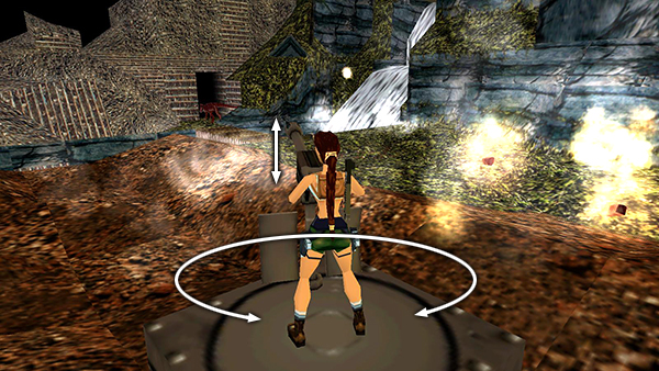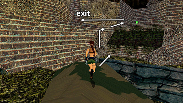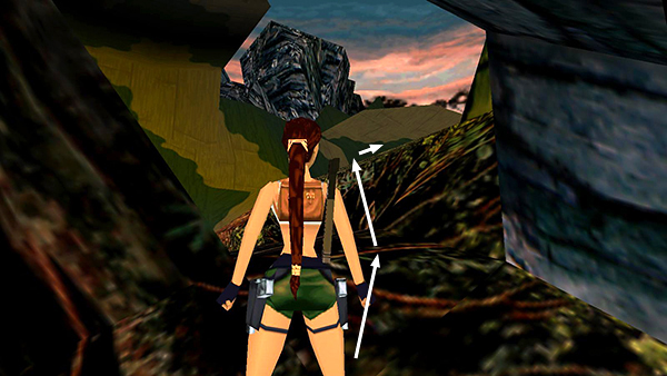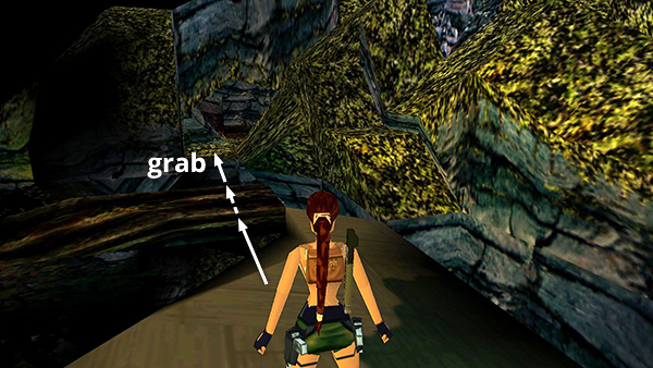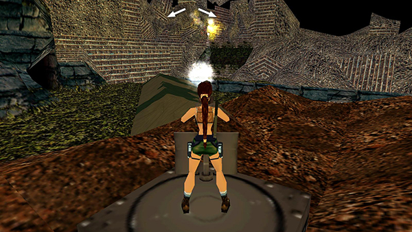 NOTE: If you're using an analog controller with the PlayStation game and you're having trouble with the sequence described above, try using the left Analog Stick instead of the D-pad to climb the ladder. This should give you greater control. Climb all the way down. Then press lightly on the stick, so Lara climbs up one rung at a time. Then when her feet come up onto the lowest rung, take the backflip.