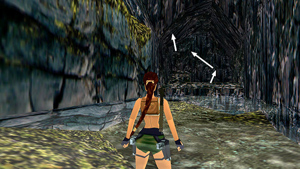 NOTE: If you're having trouble with this section because it's so dark in the cave, note that using flares will help but can also cause problems. If Lara is holding a flare, she will not be able to drop from overhead bars and grab onto a climbable wall, which is necessary in two places within the cave. Instead, turn up the brightness on your TV/monitor or, if you're playing the PC/Mac version, adjust the in-game gamma setting. Press Escape to open the menu ring, press Down to go to the lower ring, rotate to the sunglasses (Video Options) and raise the gamma setting. The default is 3, but you may want to crank it up to 7 or 8.