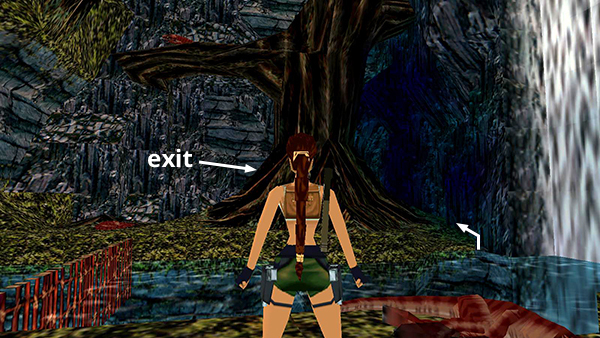 Return to the pool, swim across, and climb out on the far right, near the waterfall. Follow the tunnel behind the big tree to get back to the crash site. (screenshot)