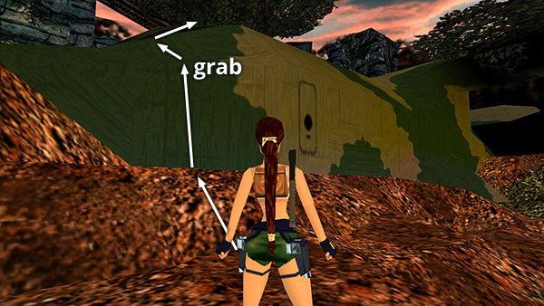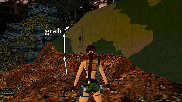 Alternatively, you can reach the ledge with the crawlspace by taking the more obvious but longer route through the treetops: Face the nose of the plane then head for the back left corner (where the second raptor originated). Climb the rocks and jump forward to grab the handholds on the tree branch above. Monkey swing forward to the trunk and drop down. Follow the branch around to the left. Take a running jump to grab the handholds on the tree trunk. Climb to the top. Jump to grab the handholds on the branch above. Then monkey swing nearly to the end of the long branch and drop onto the ledge below. Climb down the rock ladder until Lara is hanging by her hands. Traverse to the left until you can pull up onto the ledge with the cave entrance. (The page with screenshots includes more detail.)