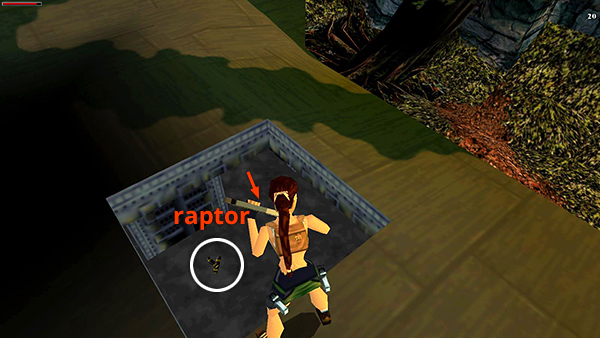 CLEARING WITH AIRPLANE WRECKAGE: Drop down and move into the clearing with the downed plane. As you explore, a second raptor (2) emerges from behind the trees on the left. You can advance to the left just far enough to trigger the raptor. Then roll, run, and jump up onto the small, triangular area in the corner just ahead on the left. The raptor can't reach Lara here. (screenshot) If it runs away after you shoot it a few times, you'll need to slide down and get its attention. Then hop back up onto the little triangle and keep firing.