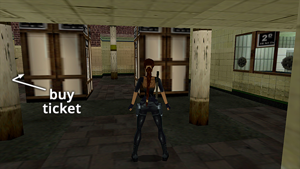 If you don't have the OLD PENNY in your inventory, you'll have to get it first so you can use it to buy the TICKET. From the TURNSTILE, go back through the crawlspace and drop into the pool below. Climb out of the water and pull up onto the next higher ledge. Then climb into the doorway above. Kill the dog in the hallway as you make your way down the stairs to the train platform below. Turn left into the tiled room with the piles of dirt. Then turn right, climb over the dirt, then go up the escalators to the TICKET ROOM. Turn left and go through either of the two doorways ahead and down the other set of escalators. At the bottom, take a running jump across the dirt-lined pit. (Remember to jump along the right side where the ceiling is higher, so Lara doesn't bang her head and fall into the pit.)