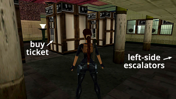 TICKET MACHINES - MISSING OLD PENNY: From the room with the ticket machines, go down the right side escalators. Take a running jump across the dirt-lined pit to the other side. Remember to jump on the right side rather than the left, so Lara doesn't bump her head on the low ceiling. (Check the screenshots for the RIGHT SIDE ESCALATORS AND MAINTENANCE ROOM if necessary.)