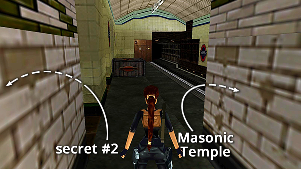 If you have not yet visited the MASONIC TEMPLE, the underwater tunnel will not be open yet. You still have some exploring to do. Exit the TURNSTILE ROOM through the doorway near the wooden crate. Crawl through the turnstile you opened with the TICKET and around to the left through the crawlspace. Then drop into the pool below. Climb out of the water and pull up onto the next higher ledge. Then climb into the doorway above. If you didn't kill the many dog in this hallway before, do so now as you make your way down the stairs to the train platform below. This is the platform at the bottom of the LEFT SIDE ESCALATORS, only you're coming onto the platform from the other side. Secret #2 is around the corner to the left. The MASONIC TEMPLE is down the tracks to the right. (screenshot) Pick up the main walkthrough with the second paragraph in the LEFT SIDE ESCALATORS section, here.